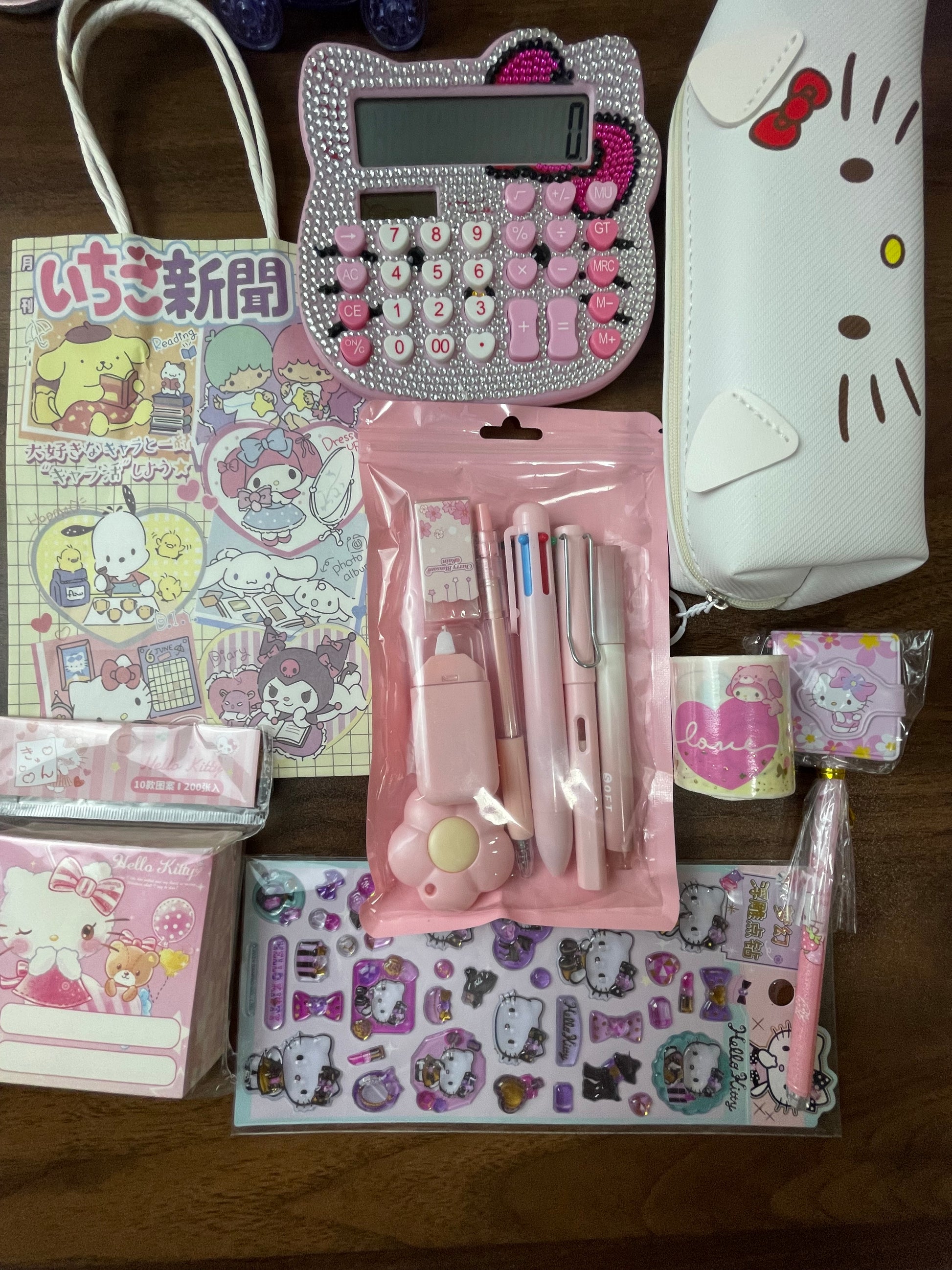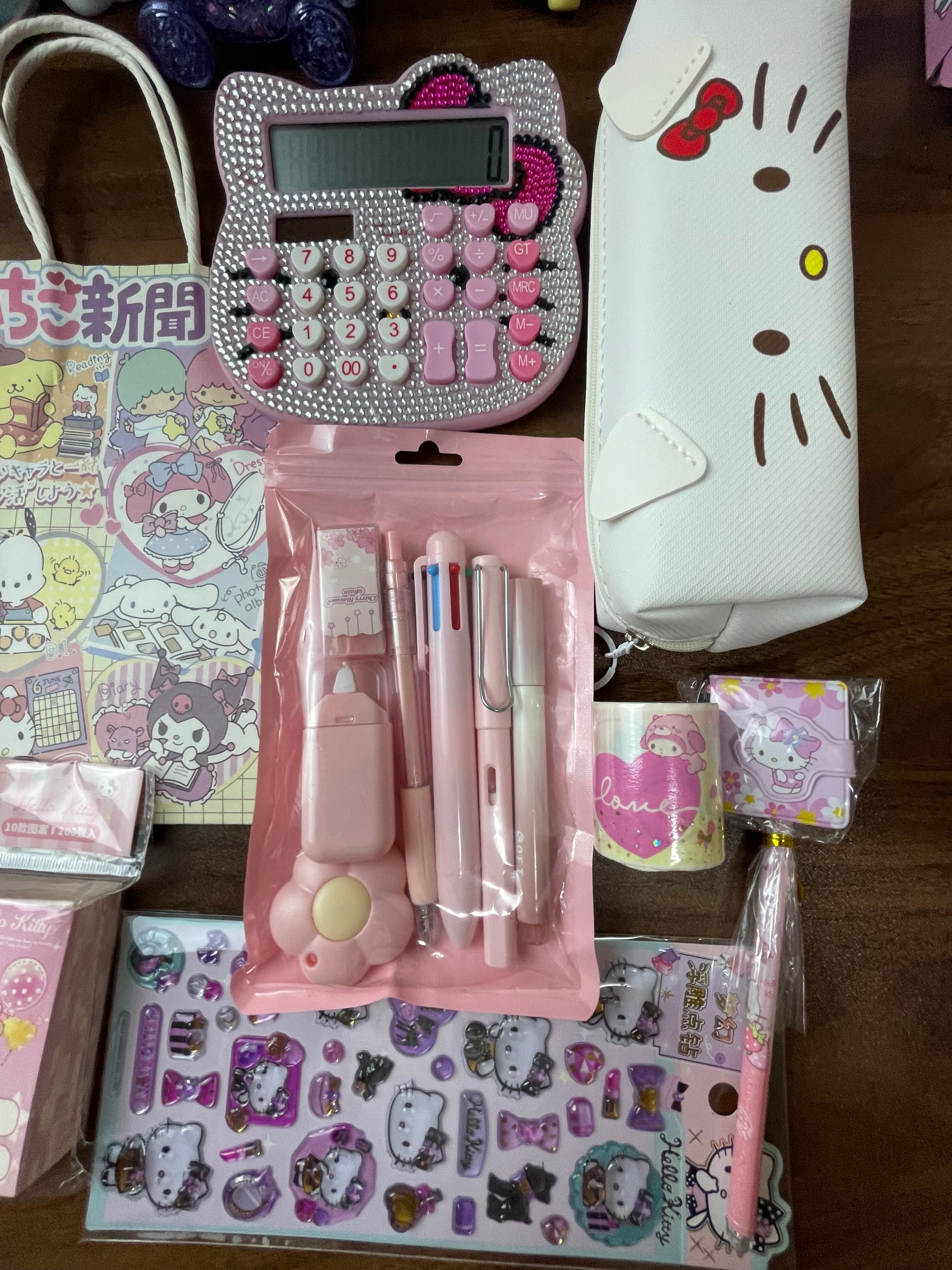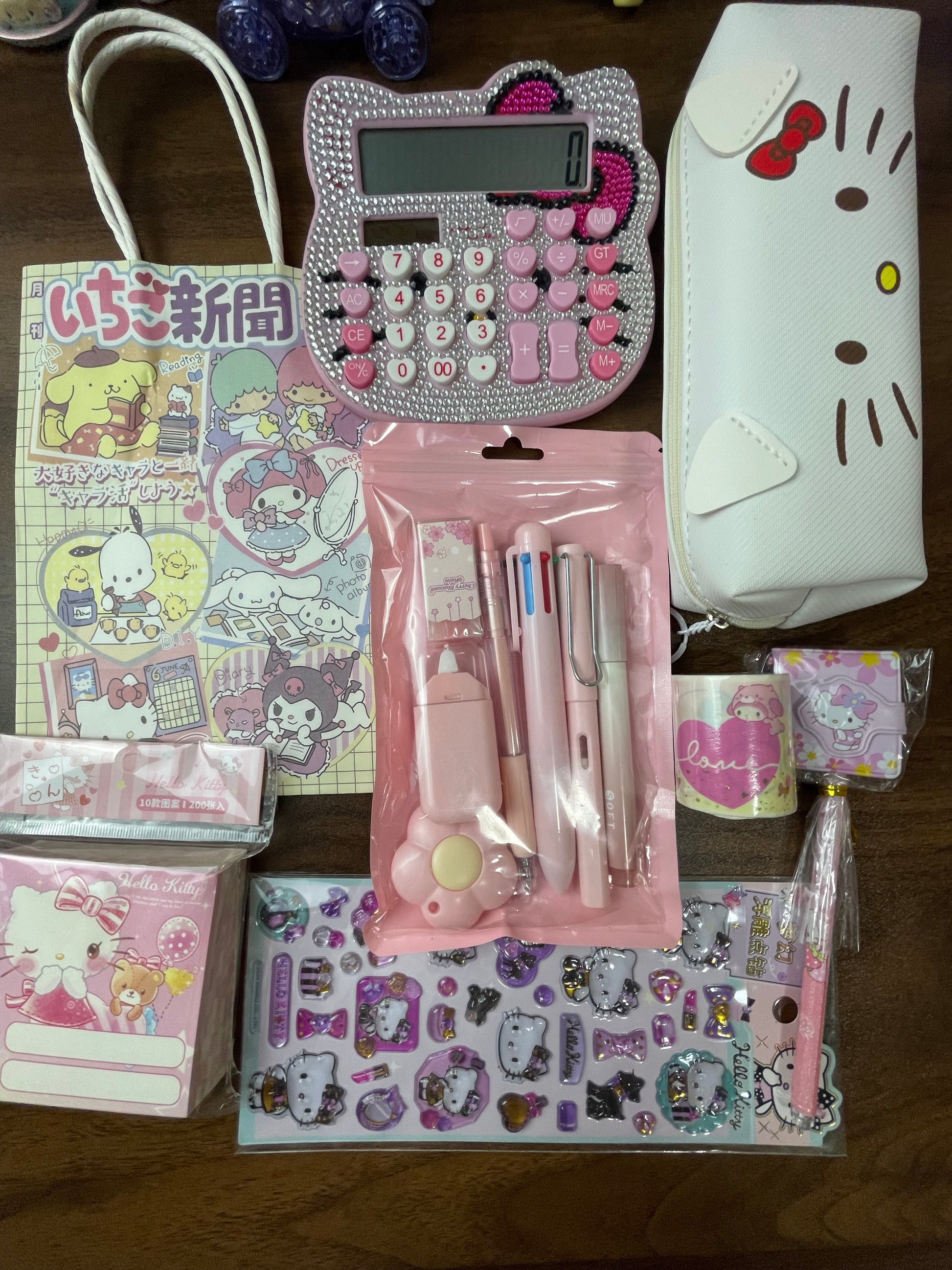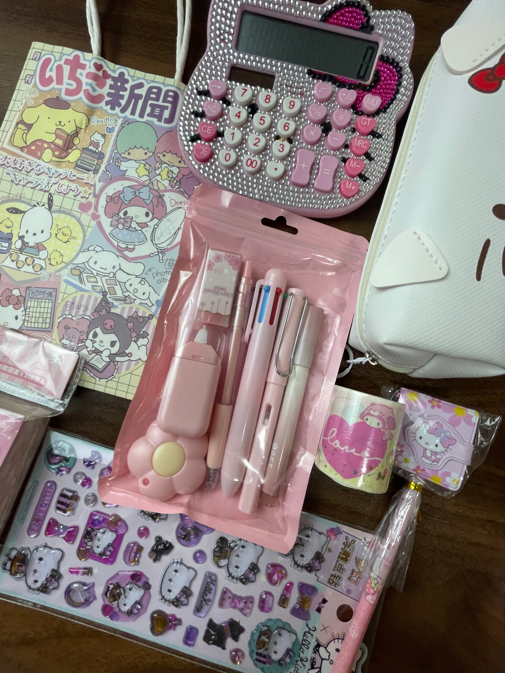 1 blinged out HK calculator, 1 pencil case , 1 washi tape , 1 pen with mini book , 1 sticky note with 200 pages, 1 sheet stickers , 7 PCs stationary / writing set plus one gift bag .