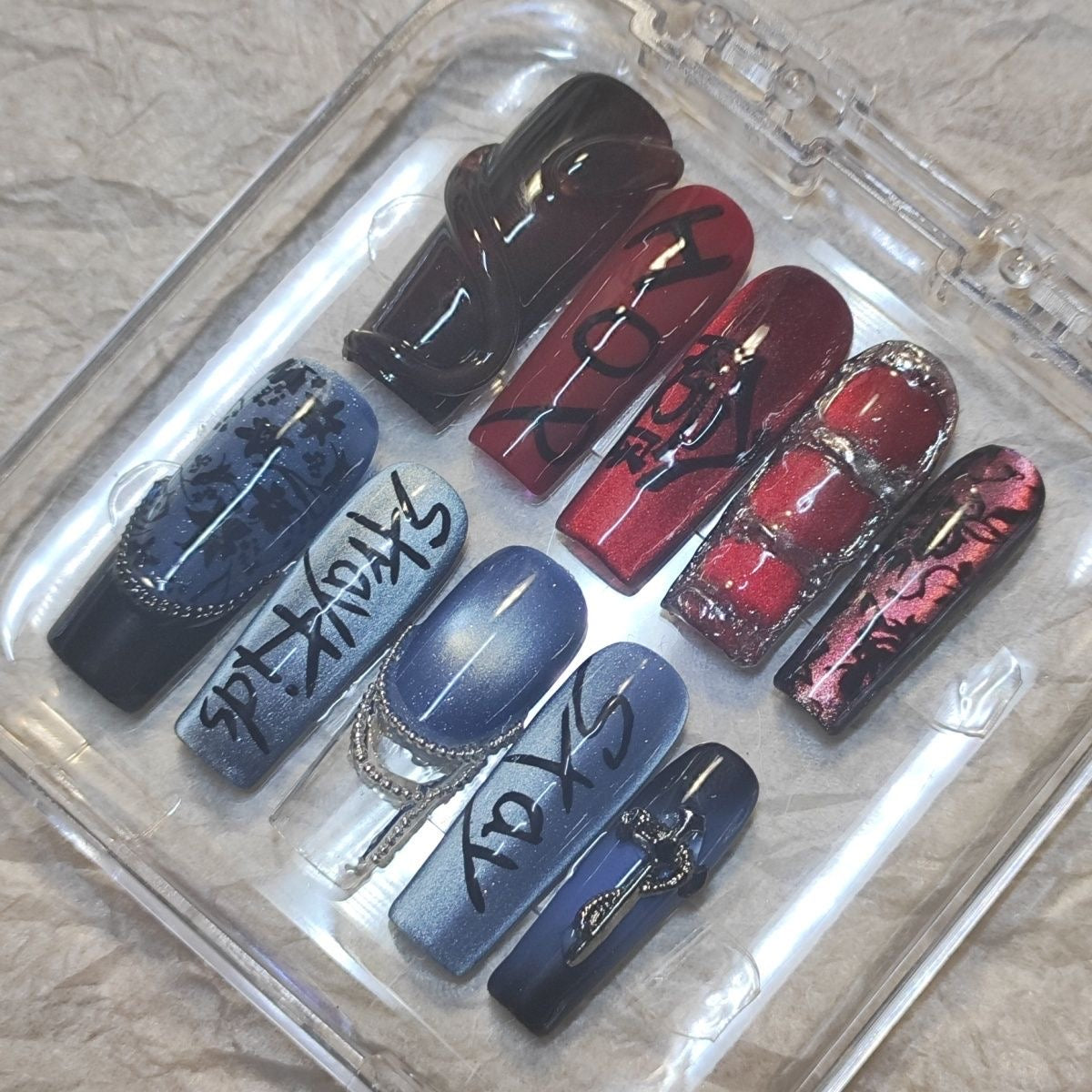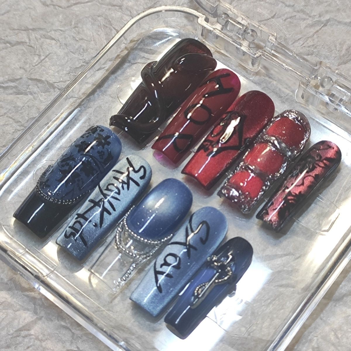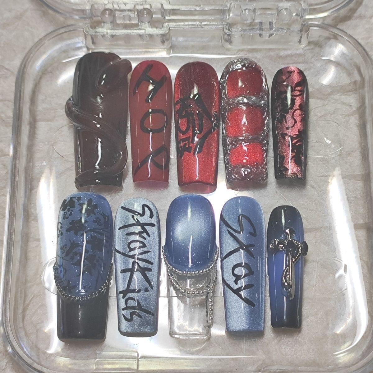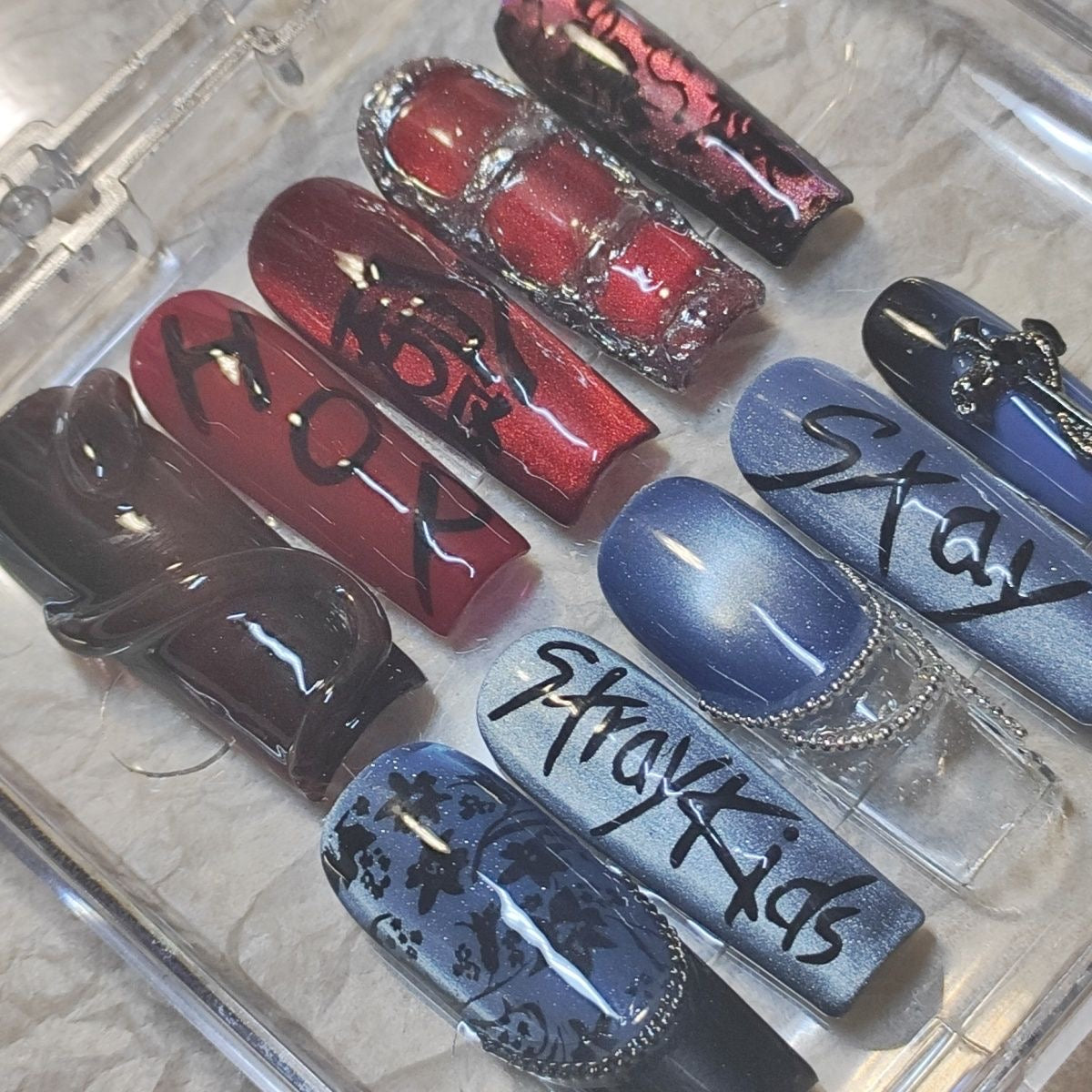 Enhance your K-pop look with these Stray Kids acrylic nails. Stay on trend and show off your love for the group while adding a unique touch to your style. These durable nails will stay on for an extended period of time, perfect for any fan or fashion-forward individual.
